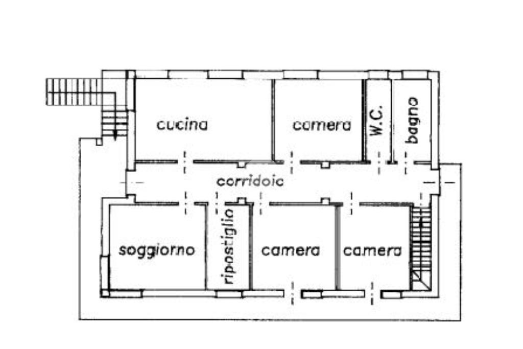 Al piano primo troviamo un grande appartamento con cucina e soggiorno assieme, tre camere da letto matrimoniali, uno studio ed il bagno.
